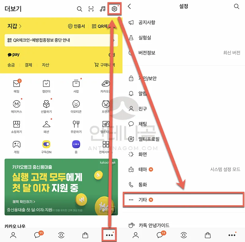 - 카카오톡 앱에서 오른쪽 하단의 더보기 아이콘을 터치합니다.