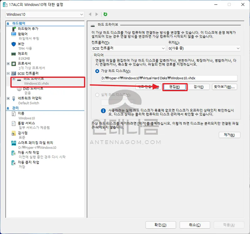 2. 오른쪽 화면에 해당 가상 컴퓨터의 하드 디스크 파일 위치를 볼 수 있는데요. 바로 아래 있는 편집 버튼을 클릭합니다.