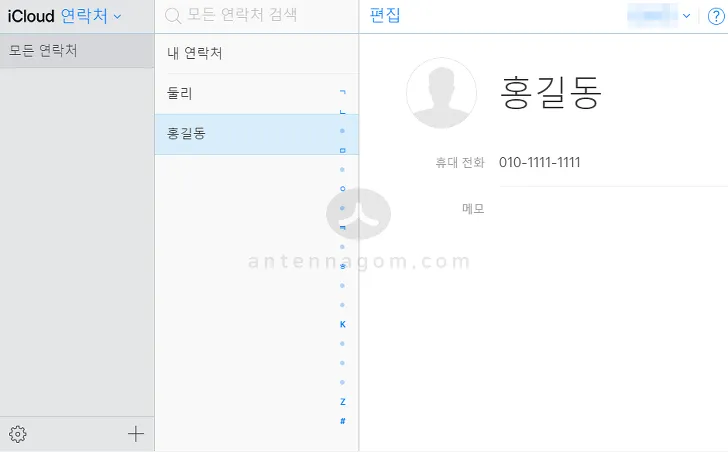 ▼ 아이폰과 iCloud 아이클라우드를 만약 동기화 하고 있다면, 아이클라우드에서 쉽게 진행할 수 있습니다. 먼저 iCloud 사이트에 접속한 다음 연락처 페이지를 엽니다.연락처에 자신이 등록한 연락처 목록이 나타나는데요. 저는 글 작성을 위해 임의로 연락처를 넣어놨습니다.