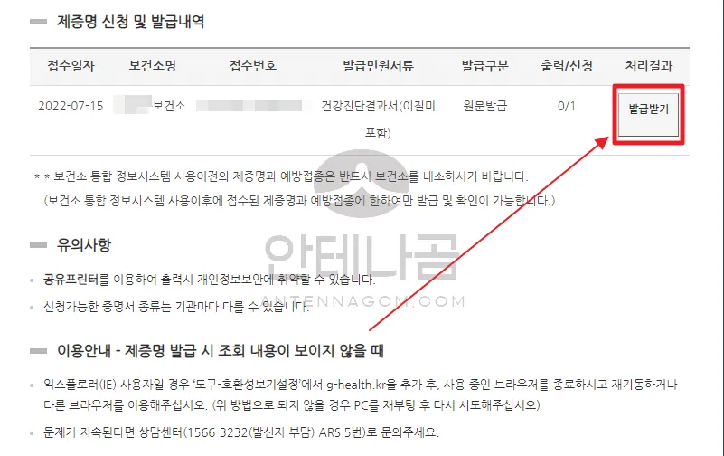 또는 공공보건포털 웹사이트를 통해 인터넷으로 발급할 수도 있습니다.
