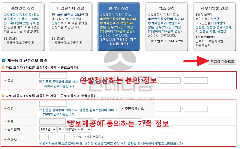 - 온라인 신청시에는 위임장과 정보제공을 하는 가족의 신분증이 필요합니다. 화면 중 중간에 있는 위임장을 다운로드하여 작성후 정보 입력 후 다음 페이지에서 신분증 파일과 작성한 위임장 파일을 업로드하면 신청됩니다.