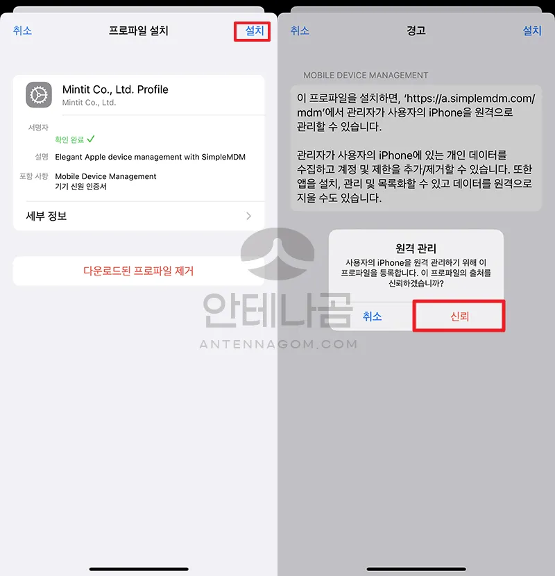 - 프로파일에 대한 내용이 보이는데요. 여기서 설치 버튼을 터치합니다.
