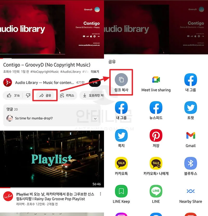 2. 팝업창이 열리면서 공유 방법이 나오는데요. 여기서 링크 복사를 눌러 해당 영상의 링크를 복사합니다.