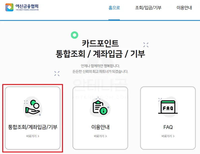 - 여신금융협회에서는 카드포인트 통합조회 사이트를 운영하고 있는데요. 해당 페이지로 접속합니다. (앱이 있기는 하지만 앱의 역할이 단순히 사이트 연결이므로 사이트로 접속하시는 것을 추천드립니다.)