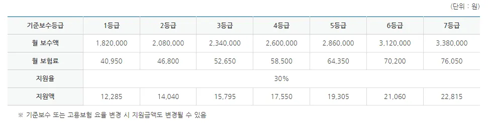선택한 등급의 기준보수액 X 2.25% (실업급여2%, 고용안정 직업능력개발 0.25%)