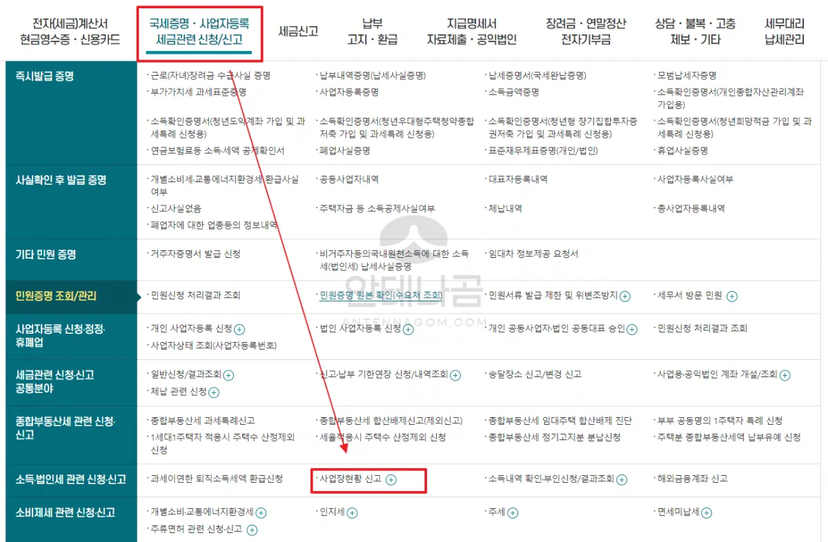 - 국세청 홈택스에서 사업장 현황 신고가 가능합니다. 메뉴 위치가 일부 바뀌어서 찾기가 좀 어려운데요. 국세증명, 사업자등록 세금관련 신청 / 신고 – 소득 법인세 관련 신청 신고 – 사업장현황 신고 메뉴에서 신고가 가능합니다.
