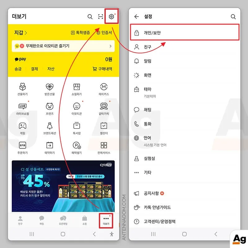 - 설정 페이지에서 개인 / 보안 메뉴를 선택합니다.