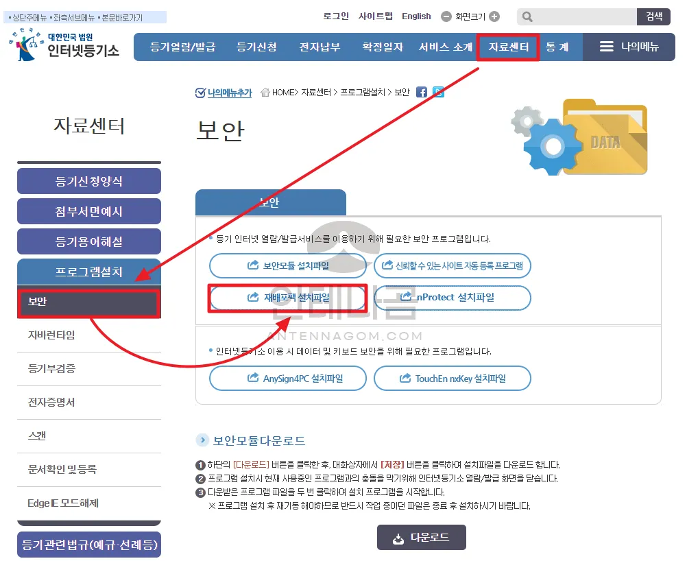 또는 위에서 설명드린 인터넷등기소 자료센터 – 보안 페이지에서 아래와 같이 보안모듈 / 재배포팩 / nProtect 파일을 모두 따로 따로 다운로드 받은 후 수동으로 설치해 볼 수 있습니다.