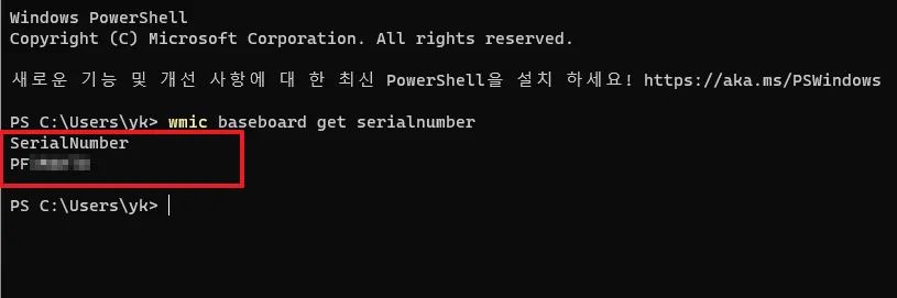 또는 동일하게 명령프롬프트 앱에 아래와 같은 명령어를 입력하면 메인보드에 기록되어 있는 해당 제품의 시리얼 번호를 확인할 수 있습니다.