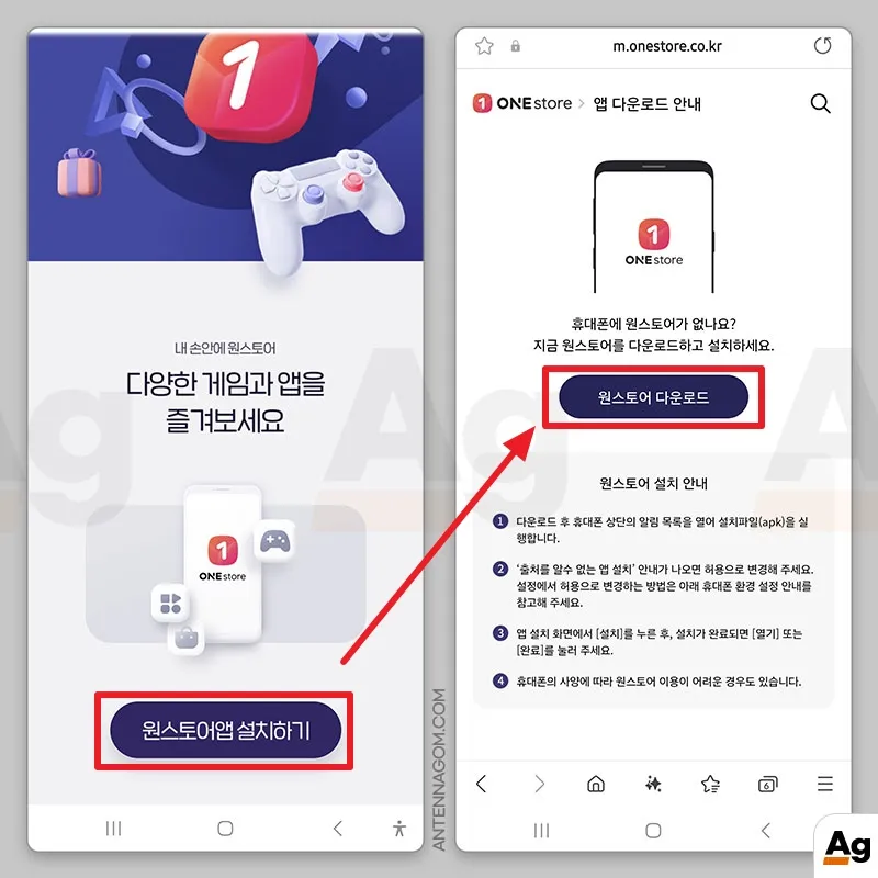 - 페이지에서 원스토어앱 설치하기 > 원스토어 다운로드 버튼을 차례로 터치합니다.