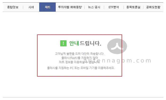 플래시를 사용한 사이트의 경우 구글 크롬 브라우져에서는 기본 상태에서는 플래시가 사용된 부분에 대해서는 나타나지 않는데요. 국내 포털 사이트 1위인 네이버의 경우에도 아래와 같이 플래시로 만들어진 컨텐츠에 대해서는 나오지 않으며 에러메세지를 나타냅니다. 큰 사이트의 경우 해결방안에 대해 도움말을 따로 마련하고 있습니다만, 이런 배려가 없는 경우 아무것도 나오지 않아 컨텐츠가 있는지 없는 지 역시 알 수 없는 경우도 있는데요.