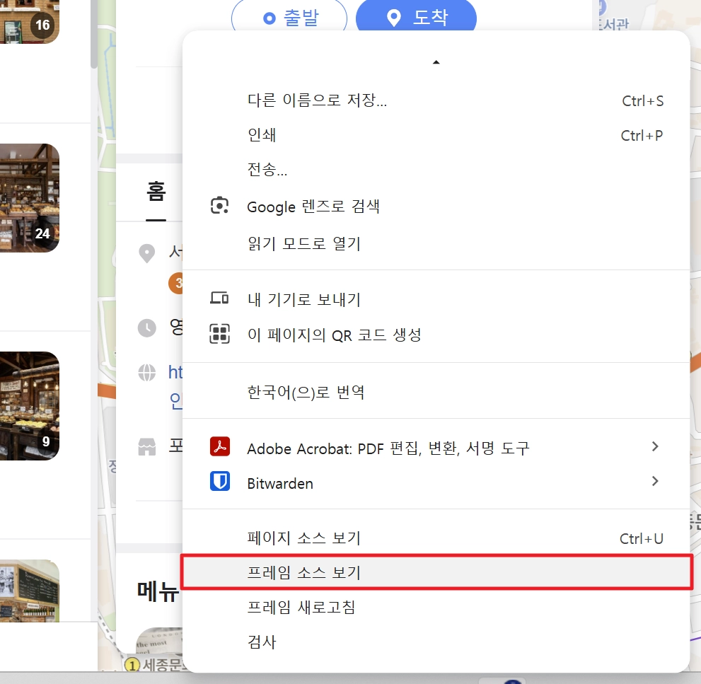 - 컨텍스트 메뉴가 나타나는데요. 여기서 프레임 소스 보기를 선택합니다.