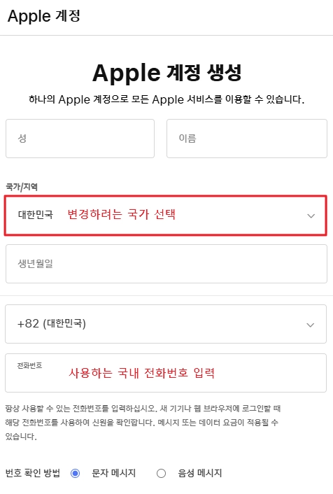 전화번호는 필수 입력입니다. 여기에는 국내 전화번호를 입력해도 됩니다. 문자메세지 인증을 받아야 하니 사용하시는 국내 핸드폰으로 입력하시고 생성하면 됩니다.