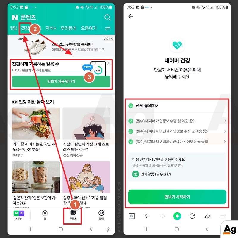 먼저 네이버 만보기를 설정해 보겠습니다. 네이버 만보기 서비스는 건강 컨텐츠 탭에서 확인이 가능합니다. 네이버 앱 디자인이 바뀌어서 찾기가 어려울 수 있는데요.