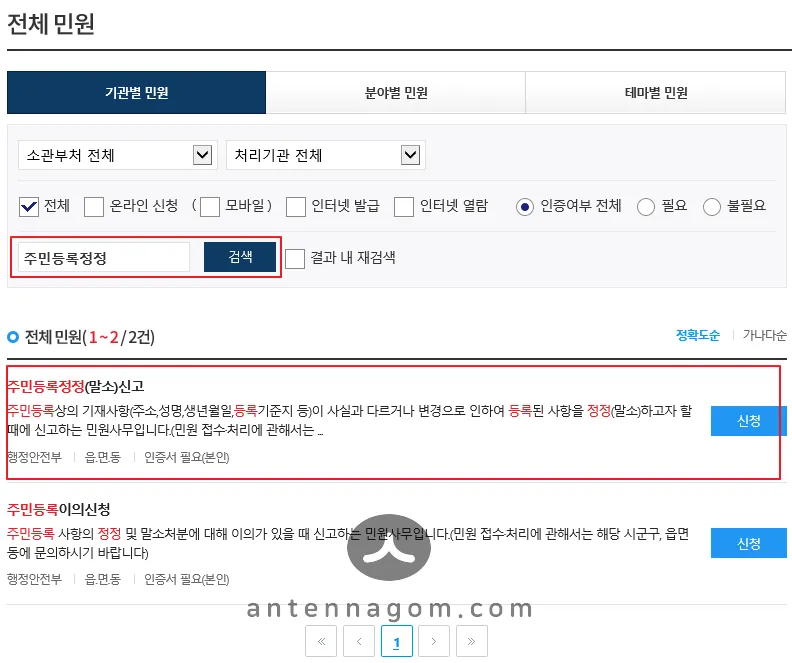 주민등록정정 으로 검색하면 아래 처럼 처리 가능 민원이 2개가 검색되어 나옵니다. 세대주 변경이라는 민원 신청은 따로 없고 주민등록정정(말소)신고 에서 세대주 변경을 신청하게 되어 있습니다. 주민등록정정(말소)신고의 오른쪽에 신청 버튼을 클릭합니다.