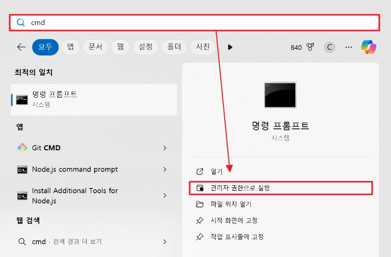 - 아래와 같이 명령 프롬프트가 검색되는데요. 여기서 관리자 권한으로 실행을 선택합니다.
