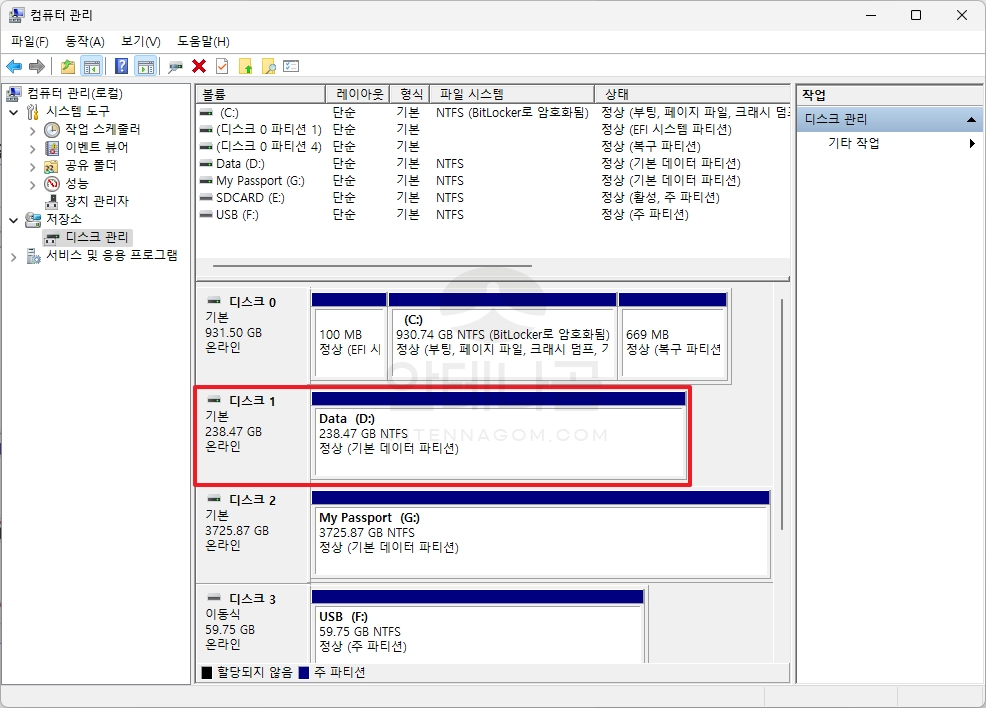 컴퓨터 관리 – 디스크 관리에서 파티션 삭제할 디스크 드라이브의 이름 (예: 디스크 1, 또는 디스크 2)와 파티션 용량 등을 확인하시는 것이 좋습니다.