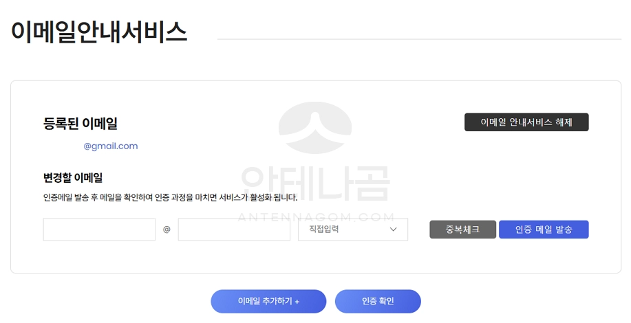 이메일 안내 서비스는 최대 2개까지 신청할 수 있으며, 신규 가입 개통시 입력한 이메일 주소를 통해 해당 내용이 자동 발송됩니다.