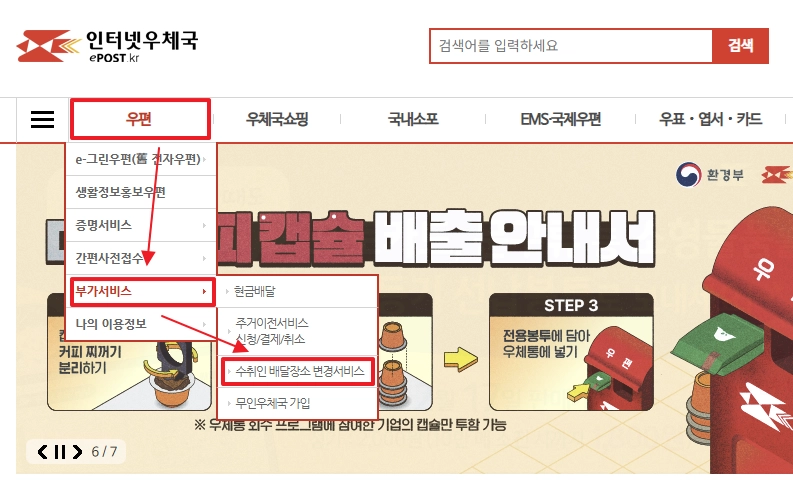 - 인터넷 우체국에서 우편 – 부가서비스 – 수취인 배달장소 변경 서비스 를 선택합니다.