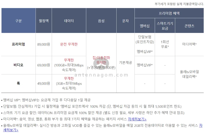 가장 중요한 요금은 부가세를 포함한 금액으로 프리미엄 89,000원 비디오 69,000원 톡 49,000원으로 구성되어 있습니다.