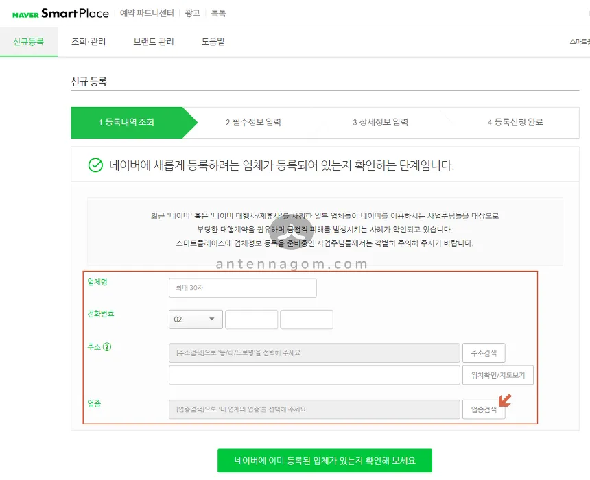 아래 버튼을 눌러 등록된 업체가 있는지 확인 후 등록한 업체가 없다면 등록 정보 입력 페이지로 넘어갈 수 있습니다.