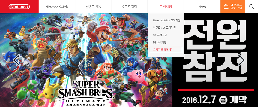 일단 닌텐도 스위치 A/S 맡기는 방법은 닌텐도 공식 홈페이지에 접속 후 고객지원 메뉴 중 고객지원 홈페이지를 클릭합니다.