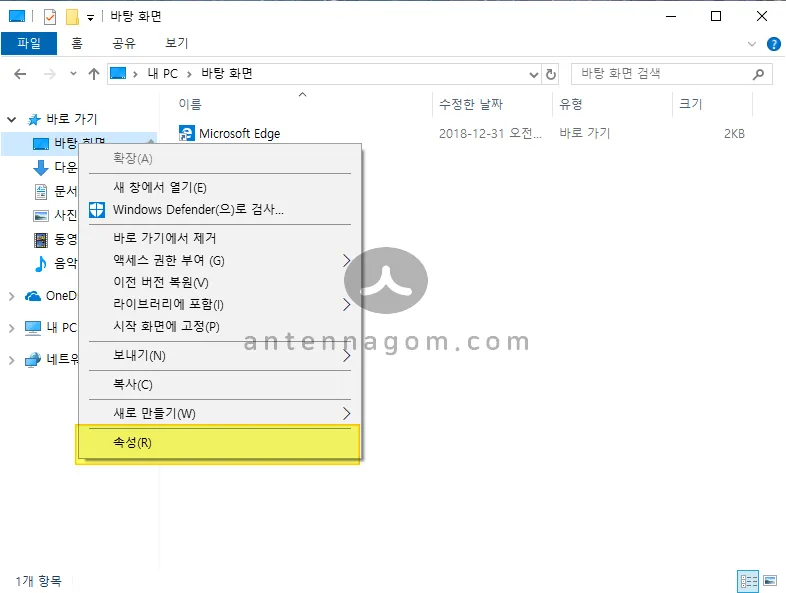 탐색기의 바로가기 아래에 바탕화면 폴더있을텐데요. 오른쪽 마우스 버튼을 눌러 추가 메뉴를 보면 제일 아래 속성이라는 버튼이 있습니다.