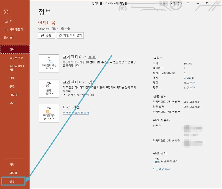 화면에서 파일 메뉴를 열면 아래와 같이 나옵니다. 이 화면에서 제일 아래쪽에 옵션 버튼을 누르면 창이 바뀌면서 옵션 창이 뜨는데요.