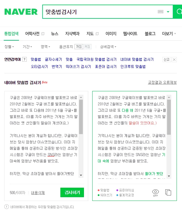 네이버에서 맞춤법 검사기를 입력하면 가장 먼저 만날 수 있는 맞춤법 검사기입니다. 한 가지 단점은 500글자 이하로만 맞춤법 검사가 가능하기 때문에 만약 긴 글이라고 하면 여러 번 잘라서 넣어야 하는 불편함이 있습니다.