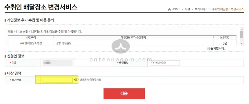 신청 버튼을 클릭하면 아래 화면을 볼 수 있습니다. 신청인 정보에 이름을 생년월일에 본인 생년월일을 입력한 후에 등기번호를 입력하고 다음 버튼을 누릅니다.