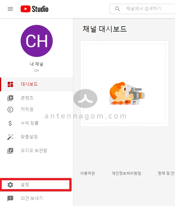 - 내 채널 페이지에서 사이드바 아래쪽에 설정 을 클릭합니다.